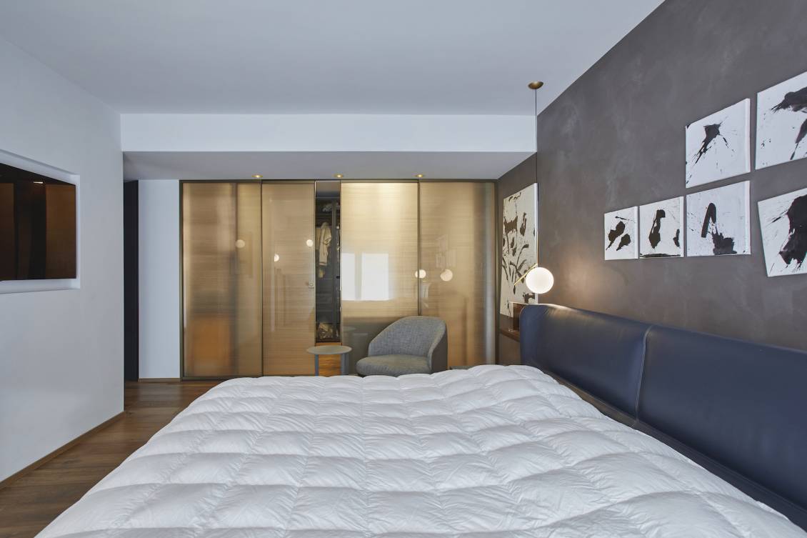 La zona notte riflette la stessa armonia progettuale che permea tutta la casa. La camera padronale, con il suo letto in rovere massello rivestito in pelle e i complementi color carta da zucchero, gioca con tonalità naturali e tocchi sofisticati. La cabina armadio, realizzata in olmo scuro con ripiani in vetro illuminati da LED, diventa un gioiello di luce e trasparenze, custodita in uno scrigno di vetro fumé dorato. Il bagno padronale, interamente rivestito in porfido lavorato ad arte, offre un’esperienza immersiva grazie a geometrie precise e finiture uniche.