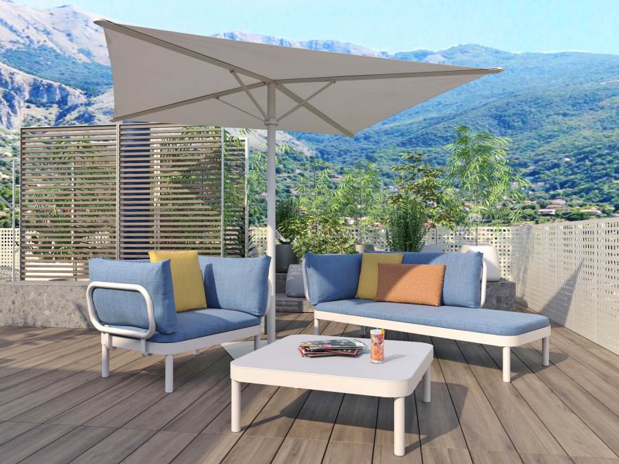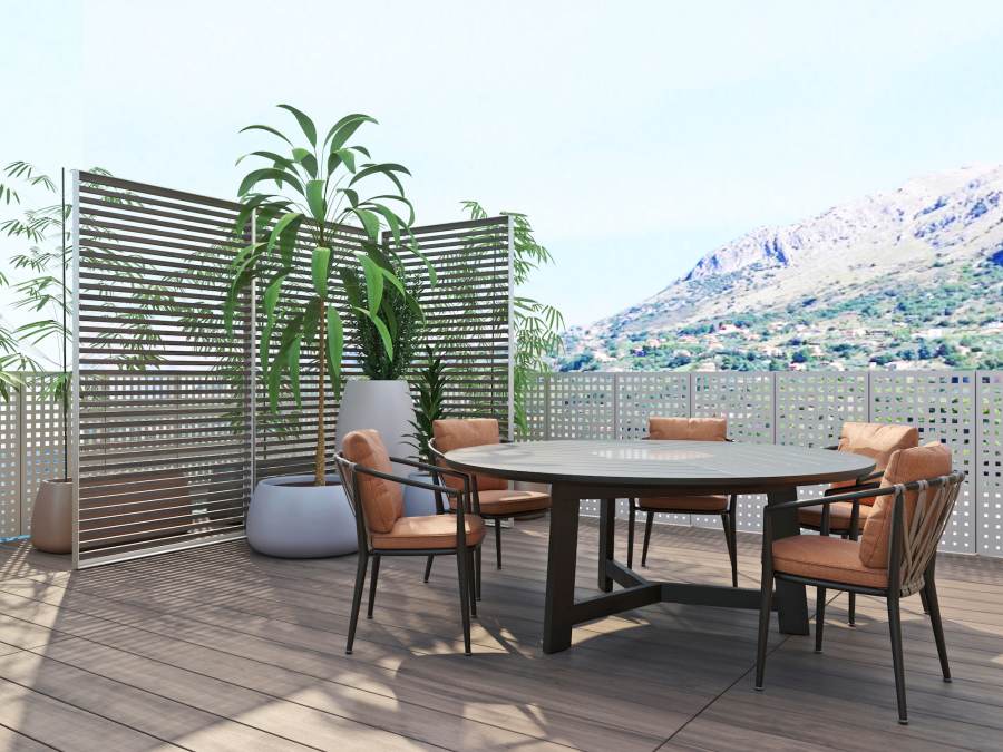 L'ambiente è scaldato dal legno teak sul pavimento, gli arredi imbottiti colorati e dai grandi vasi con piante che costellano i vari ambienti. Sono state pensate anche diverse tipologie di schermatura solare in modo da rendere il terrazzo godibile anche nelle ore più calde della giornata.