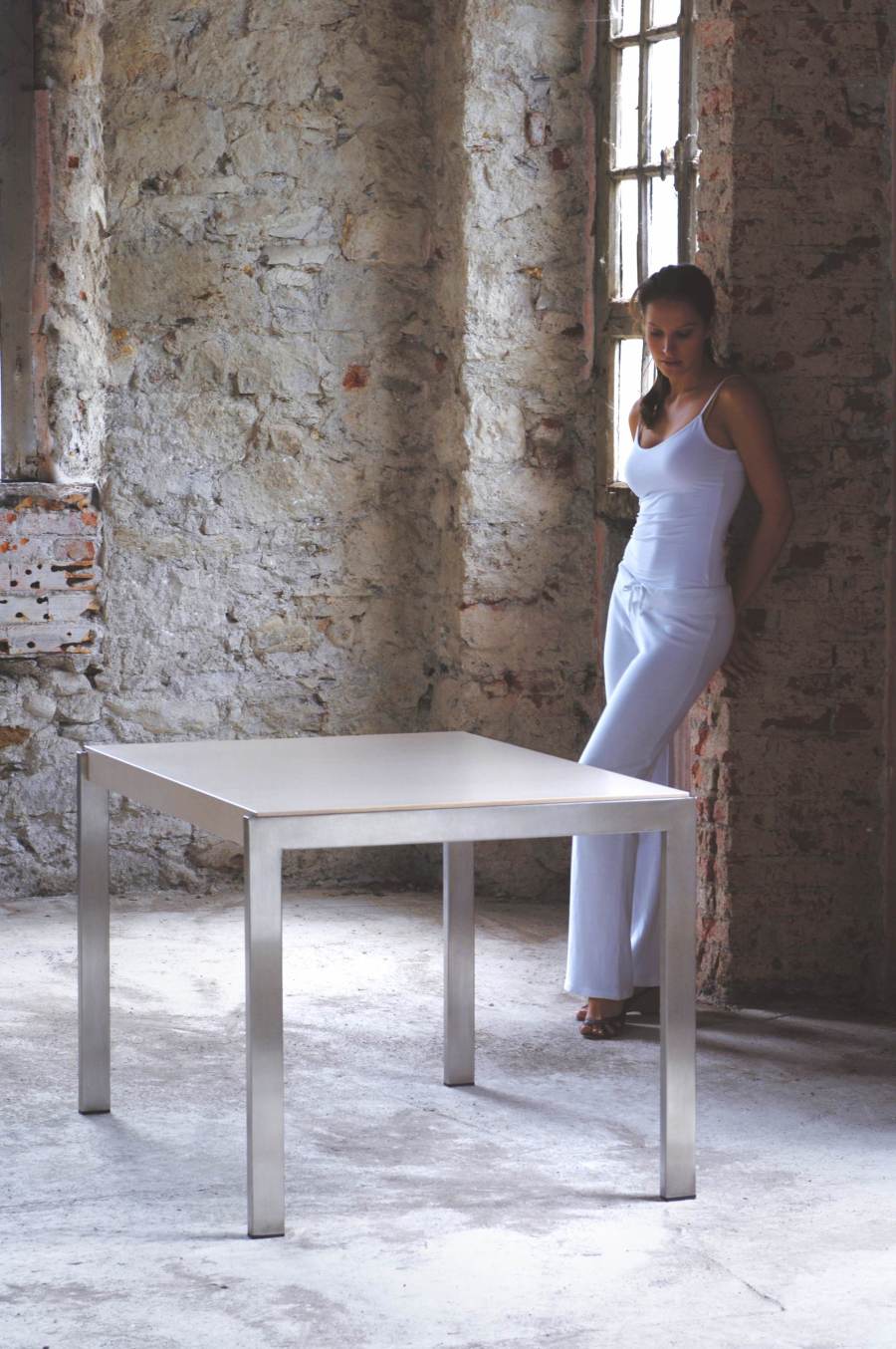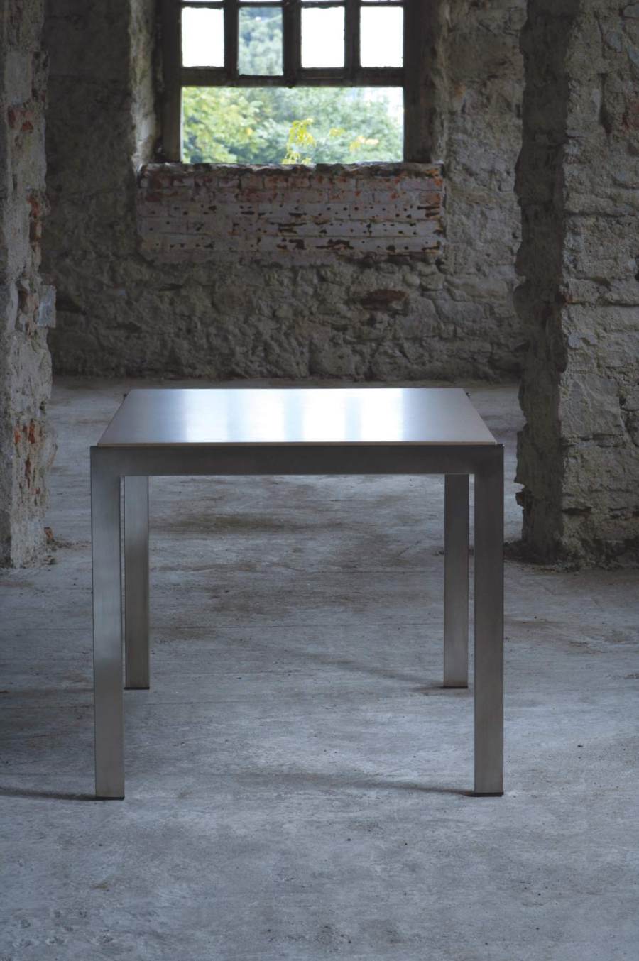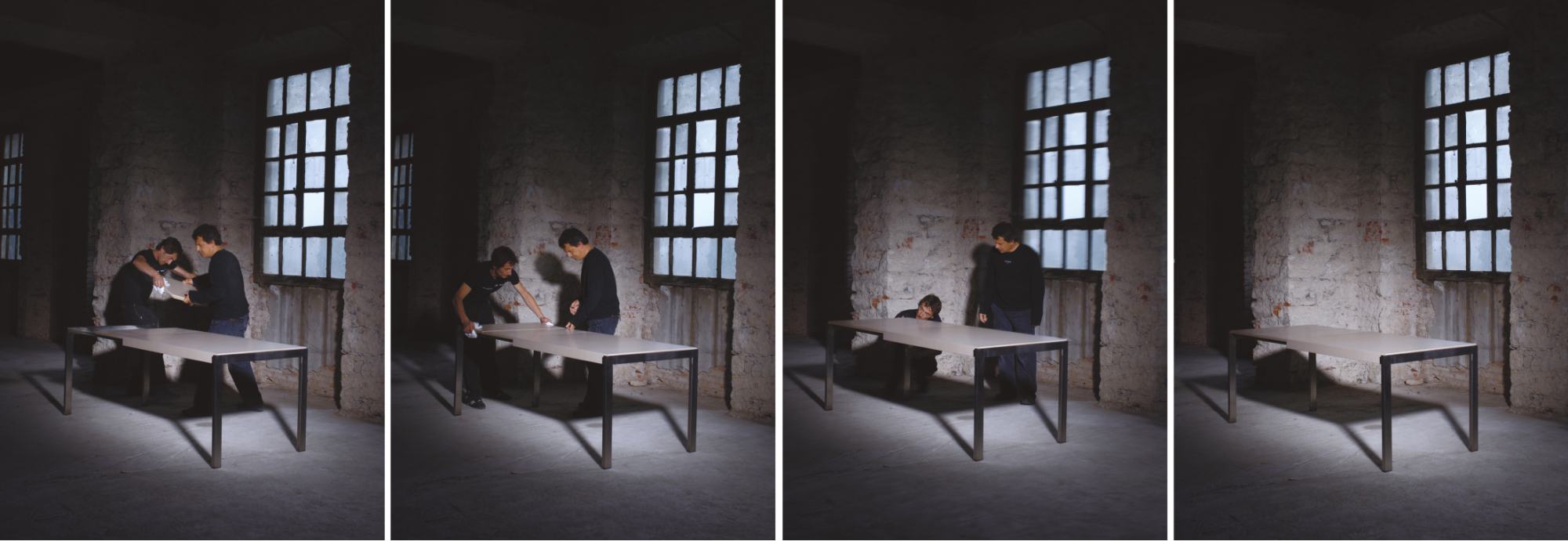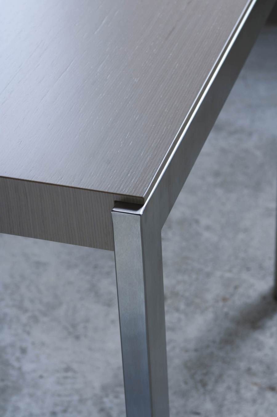 Tavolo allungabile in legno impiallacciato e acciaio.