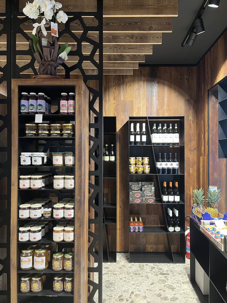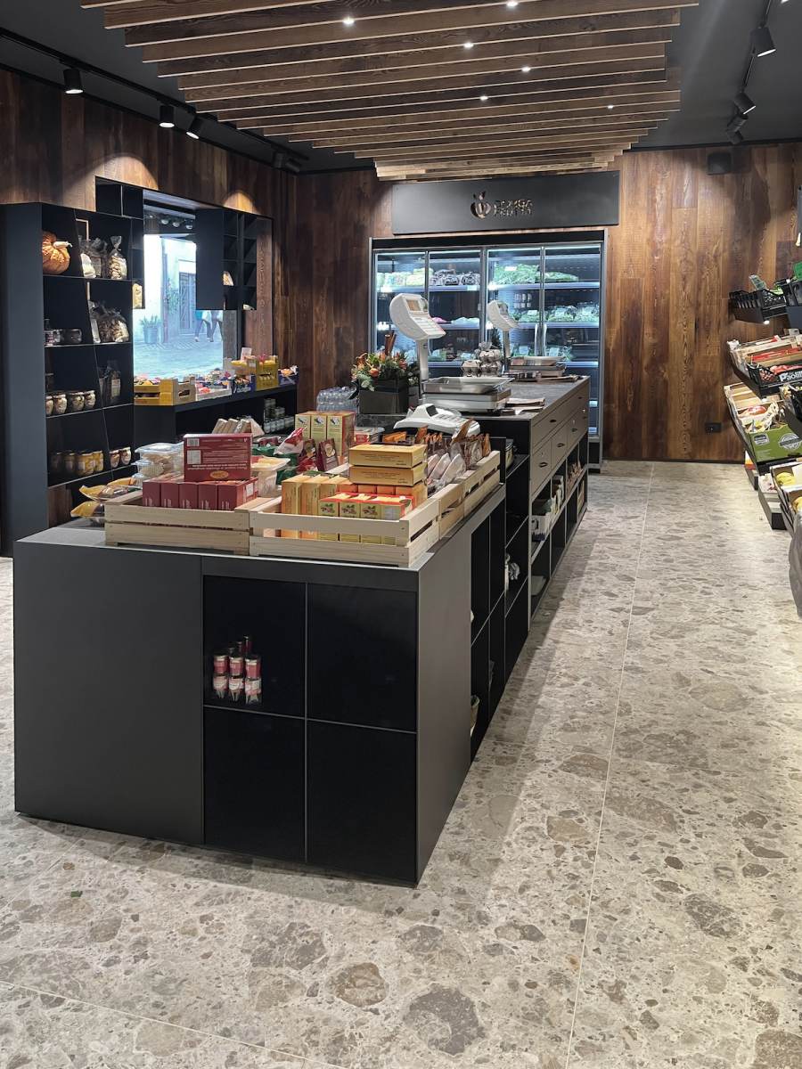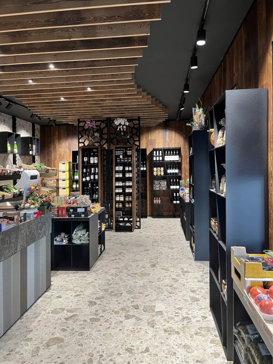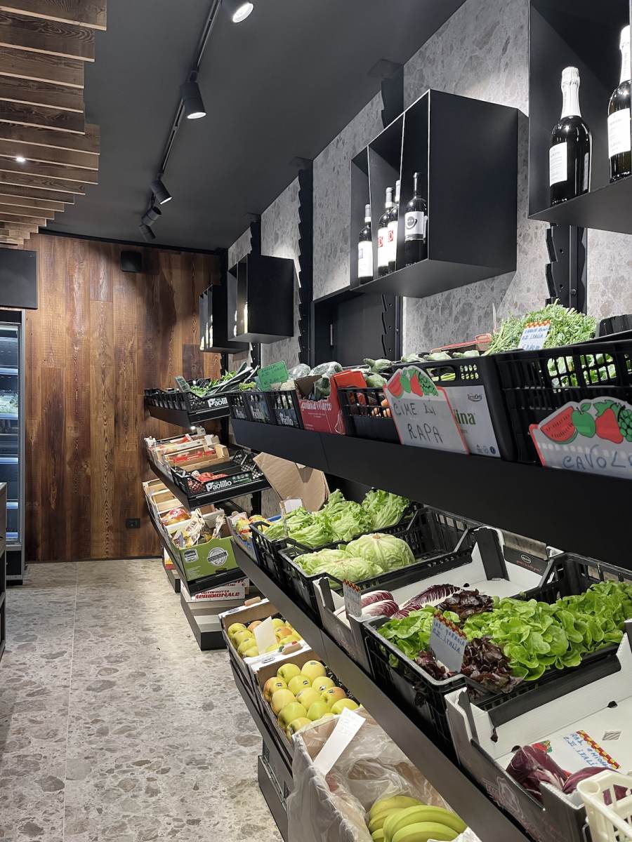 Per la medesima funzione è stata scelta la tinteggiatura del soffitto realizzata con idropittura traspirante. Il suo colore scuro ed avvolgente enfatizza il sapiente gioco di luci. Il progetto illuminotecnico ha prestato particolare attenzione all’intensità e alla gradazione di colore della luce, con l'obiettivo di esaltare le caratteristiche cromatiche dei prodotti ortofrutticoli esposti in negozio.L'inserimento di VMC (ventilazione meccanica controllata) infine, è un dettaglio costruttivo pensato per la gestione ottimale dello scambio d’aria tra ambiente interno ed esterno, garantendo un ottimo controllo della temperatura dell’ambiente di lavoro per evitare il deterioramento di frutta e verdura.