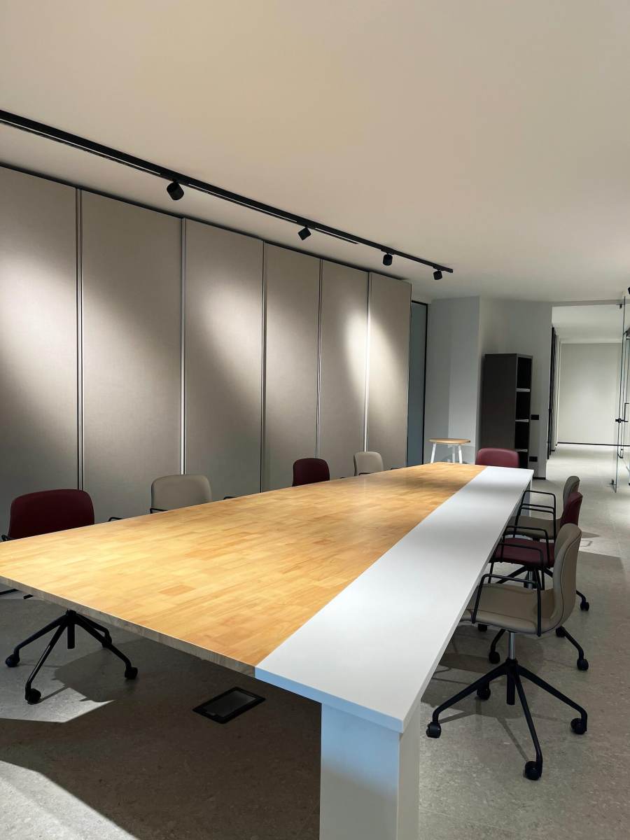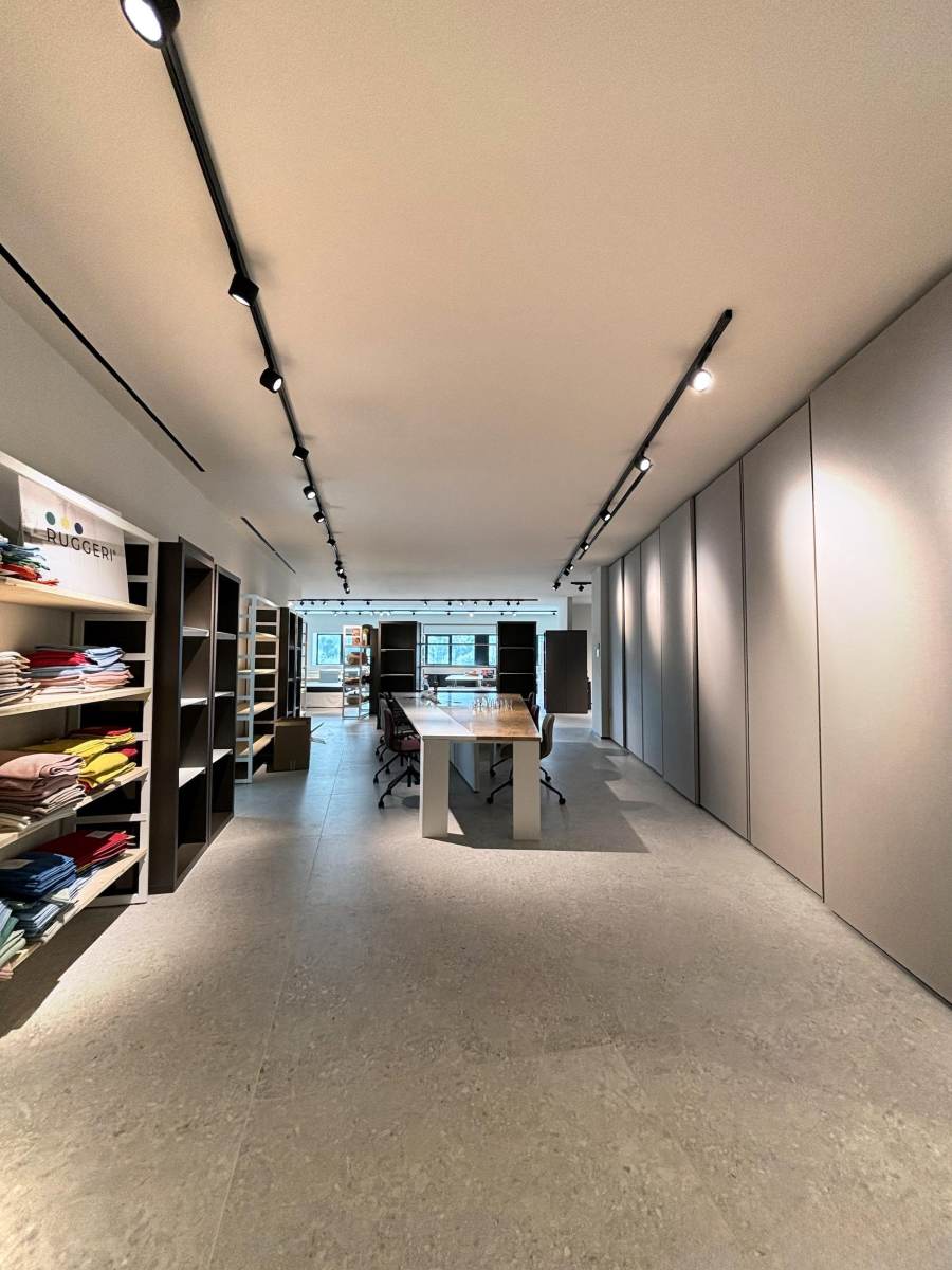 Materiali, colori e finiture sono stati scelti con cura, in armonia con l’attività dell’azienda e con attenzione particolare all’acustica, al benessere ambientale e alla sostenibilità. Lo showroom rappresenta il cuore espositivo della sede: uno spazio luminoso e modulare pensato per accogliere clienti e partner in un contesto che esalta la qualità e la versatilità dei tessuti Gilania.