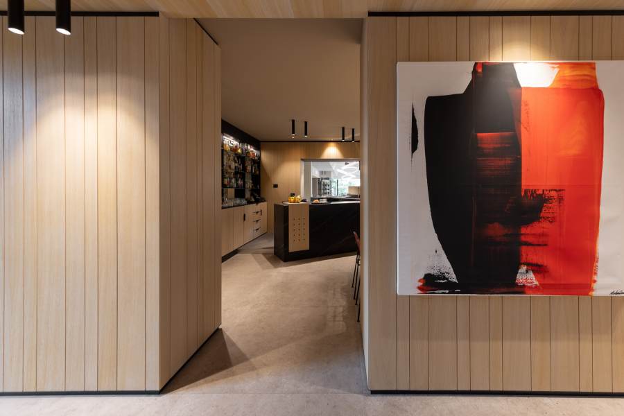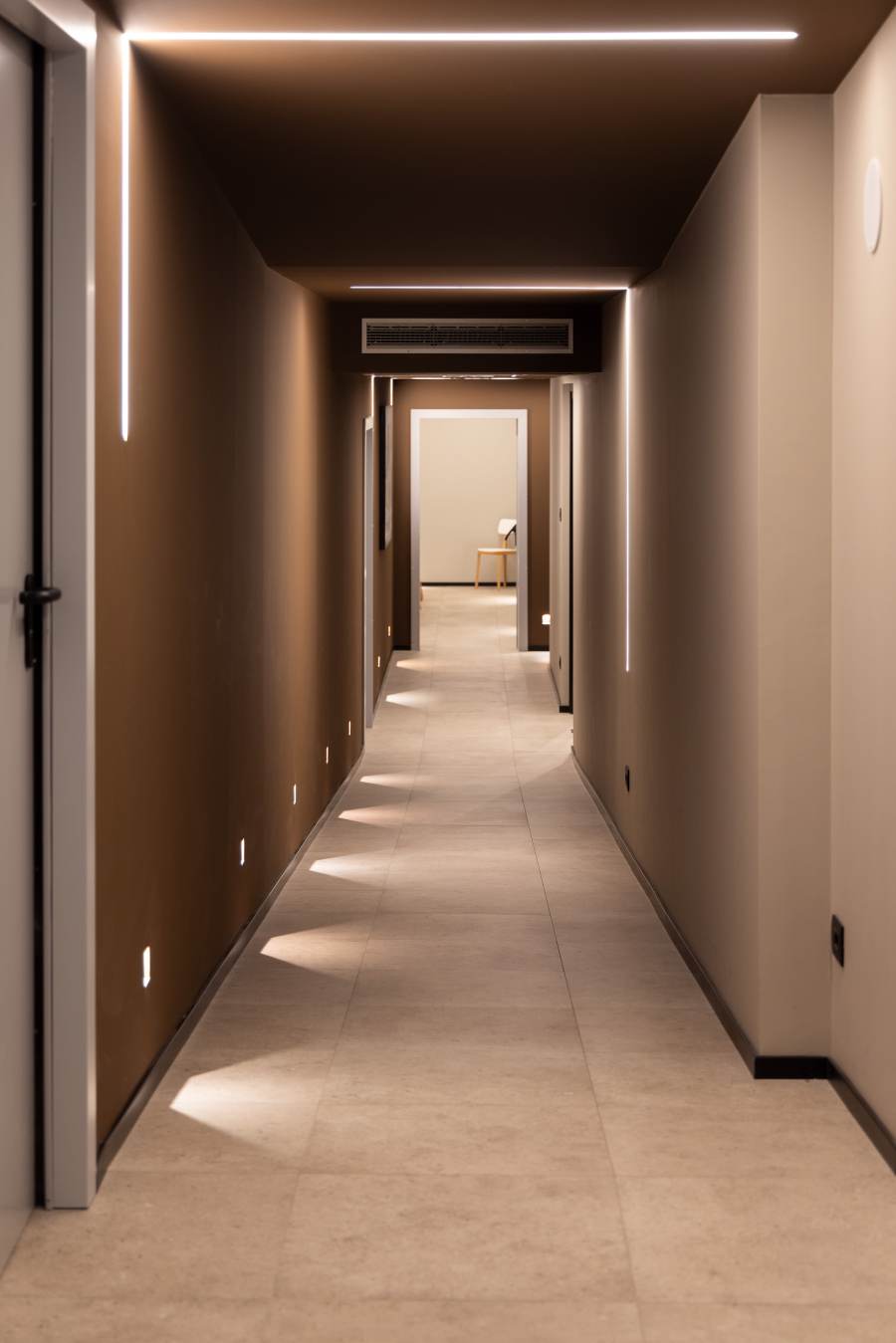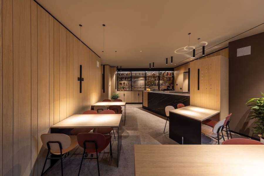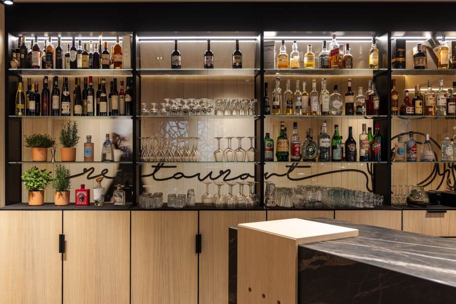 L’ingresso luminoso introduce alla lounge e alla reception, più raccolta e intima, da cui si accede al bar dominato da un bancone monoblocco in grès e da un mobile bar in legno, acciaio e vetro.