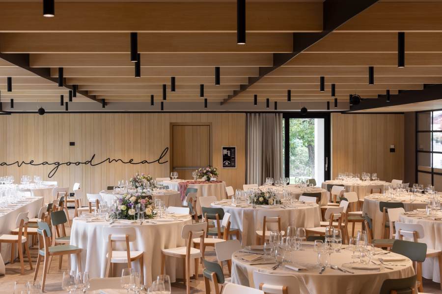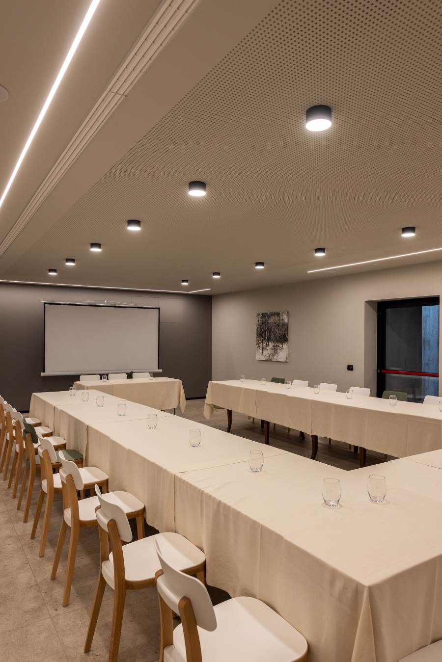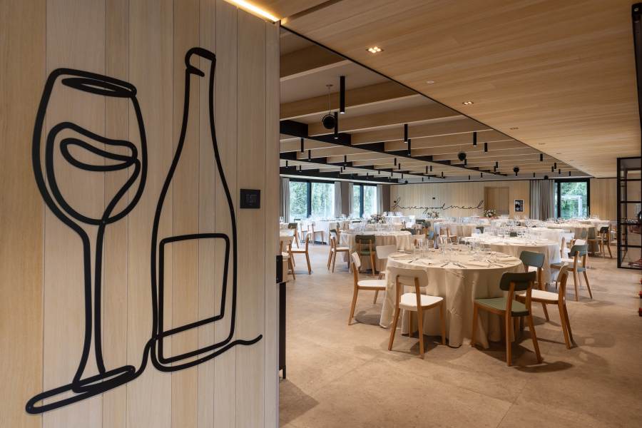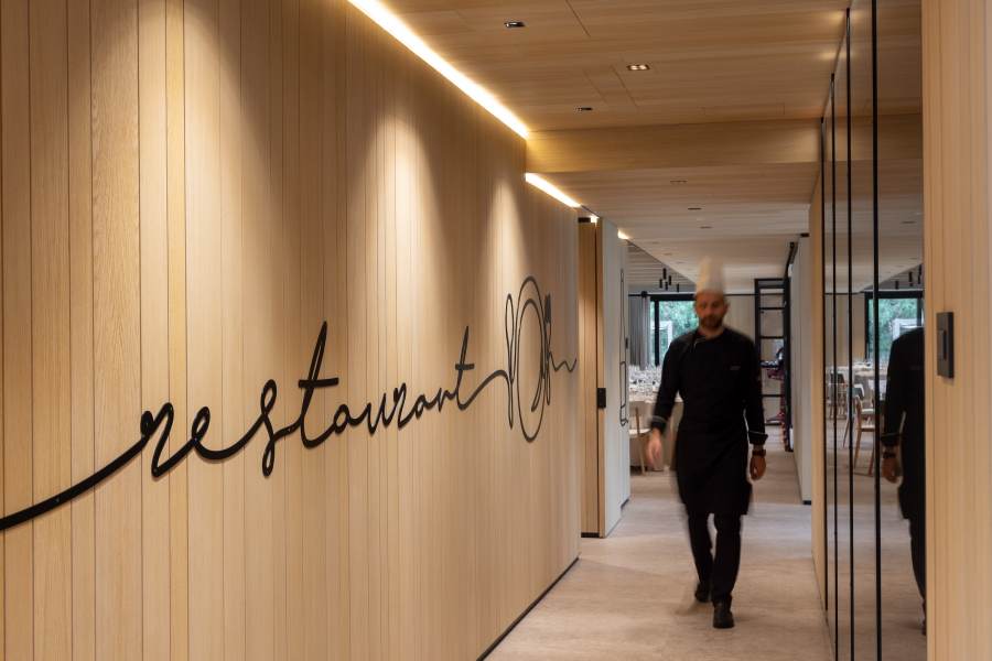 Il lungo corridoio decorato con lame in ferro richiama l’identità visiva dell’hotel e accompagna al ristorante, spazio ampio e luminoso con soffitto in travi di legno e acciaio, illuminazione regolabile e arredi su misura.