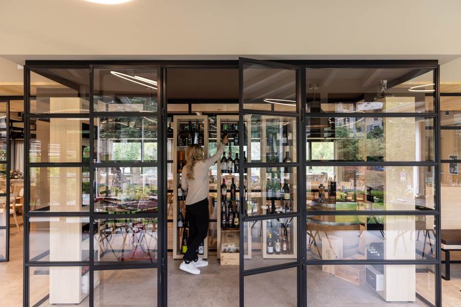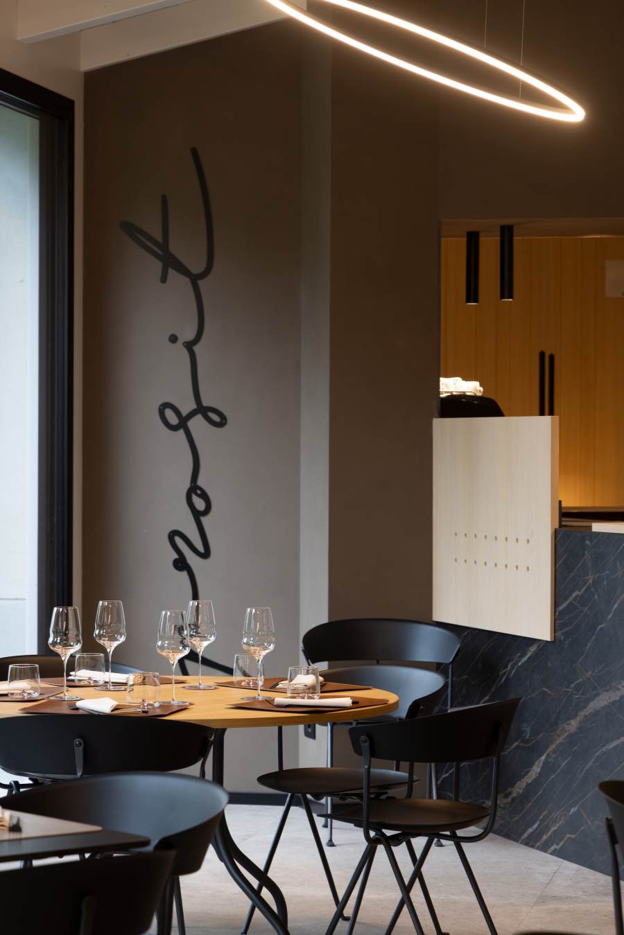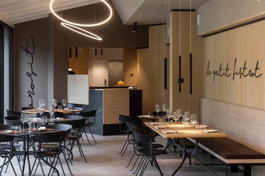 Accanto si trova il “petit bistrot”, ricavato inglobando la vecchia veranda e separato dal ristorante tramite una vetrata centrale e una cantinetta a scrigno; arredi in ferro e lampade di design completano l’atmosfera.