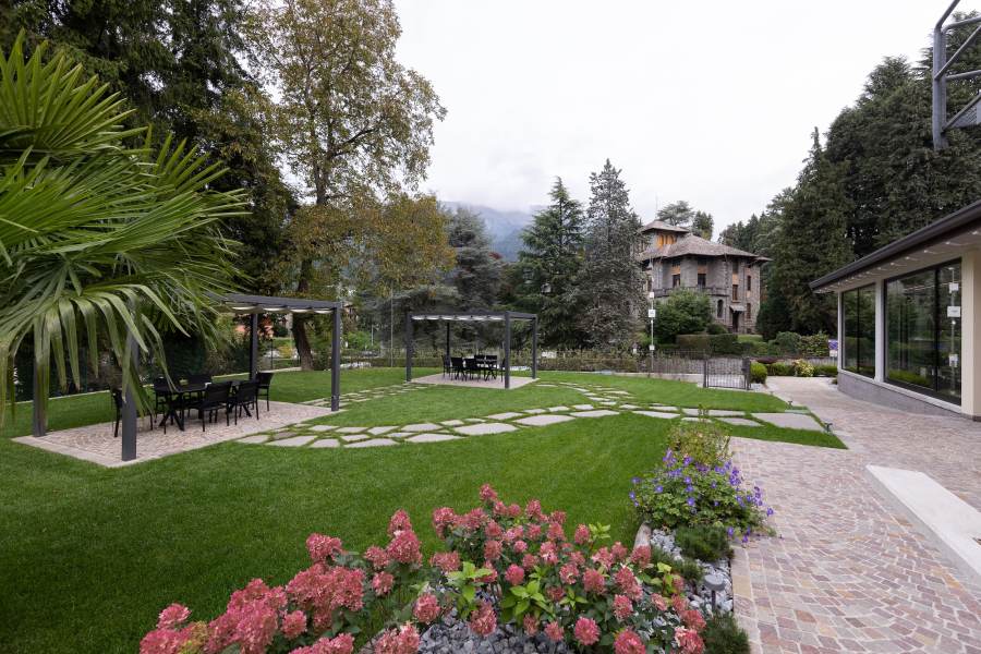 All’esterno il giardino è stato ripensato con aree relax coperte, mentre nel piano interrato sono state create una saletta bimbi e una sala conferenze.