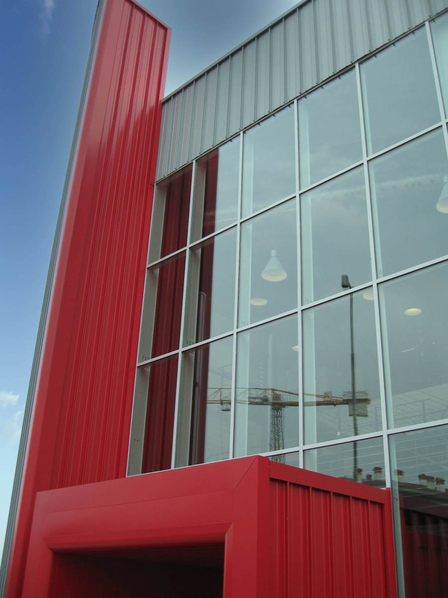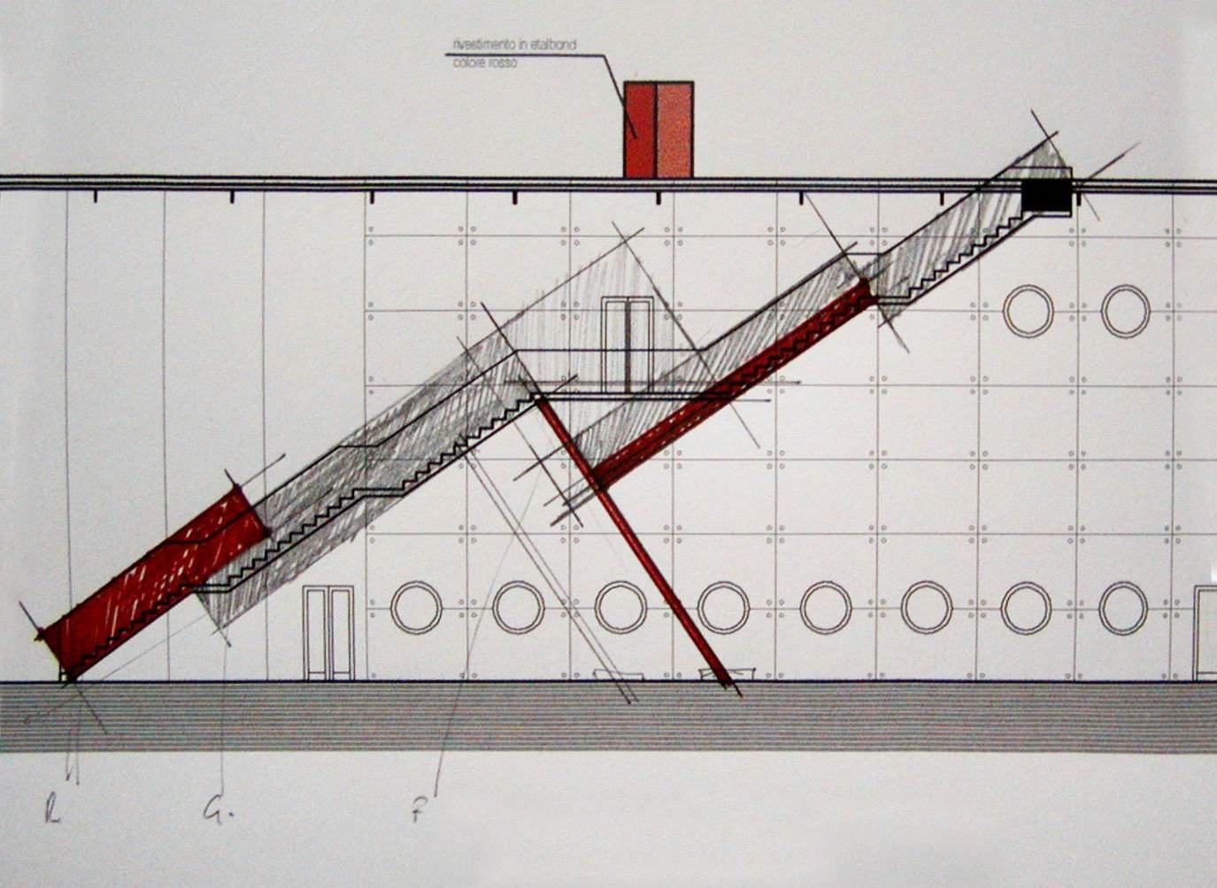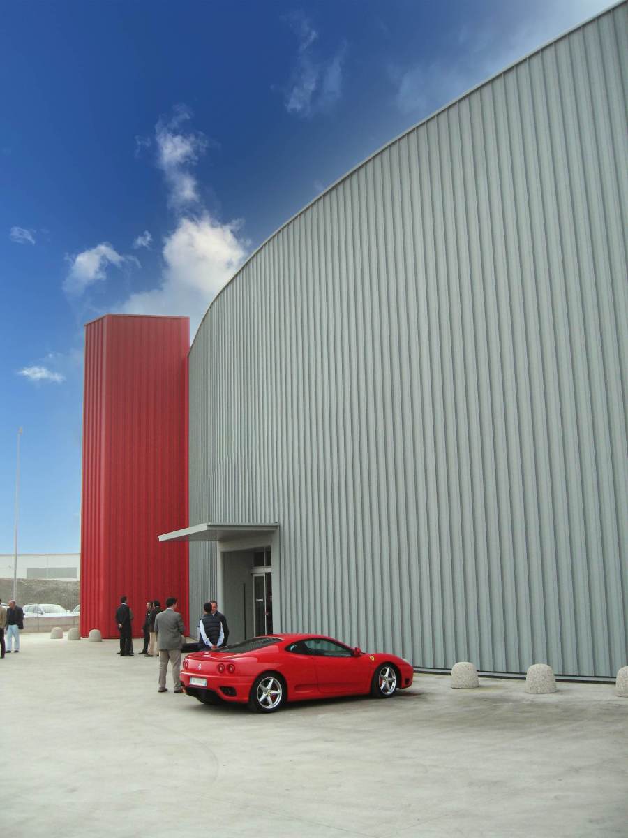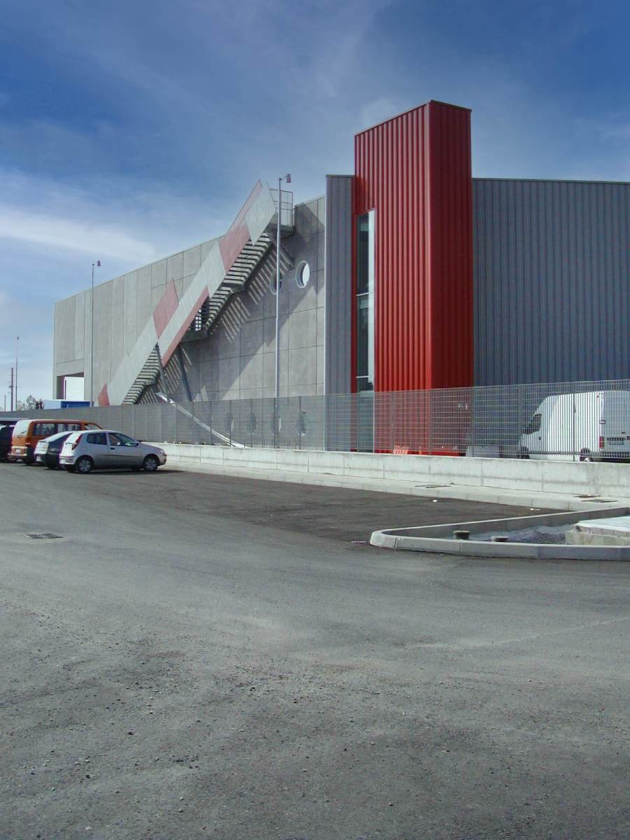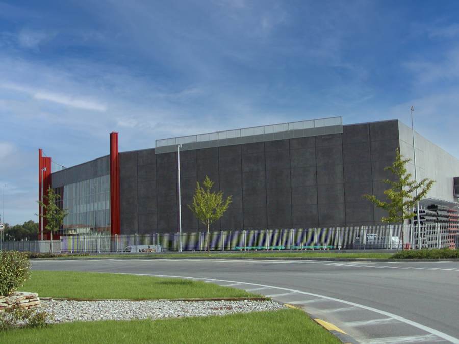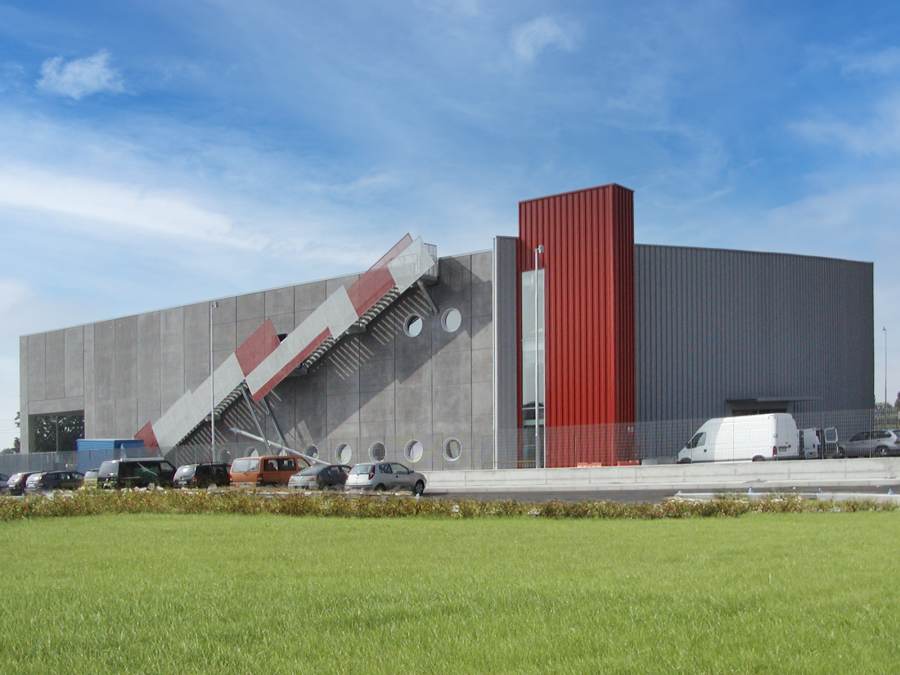 Prefabbricato in cemento, tamponato con pannelli in cemento ossidato di colore nero fumo. Struttura caratterizzata da una grande parete in lamiera grecata di alluminio ad andamento curvo e dal motivo grafico dalla scala di emergenza posizionata sul fianco.L'intera realizzazione, comprensiva degli allestimenti interni per un totale di 3700 mq, ha richiesto 10 mesi di lavoro.