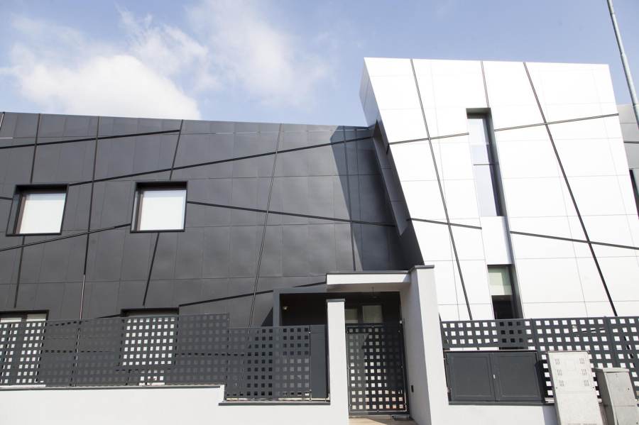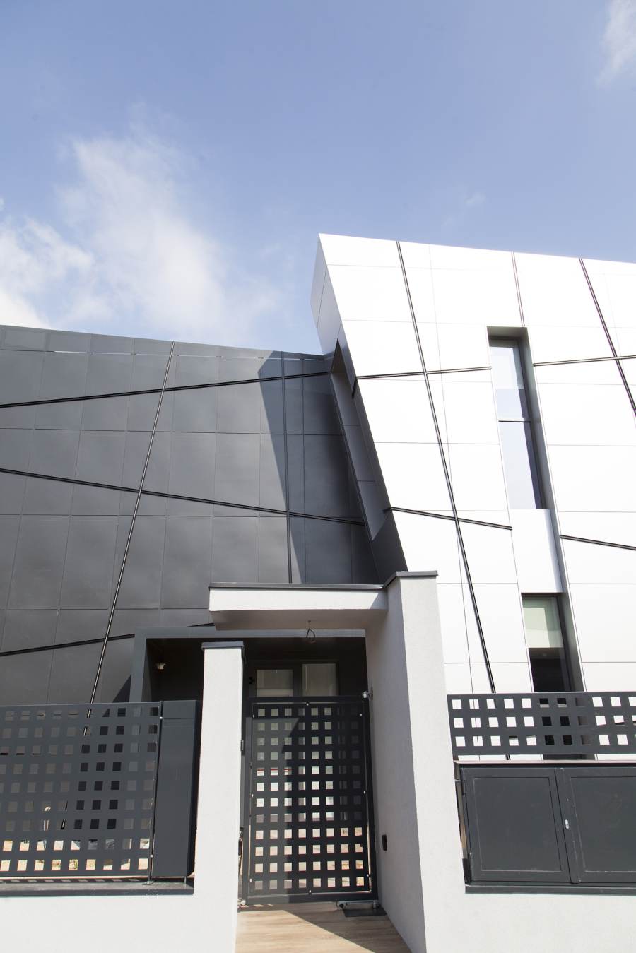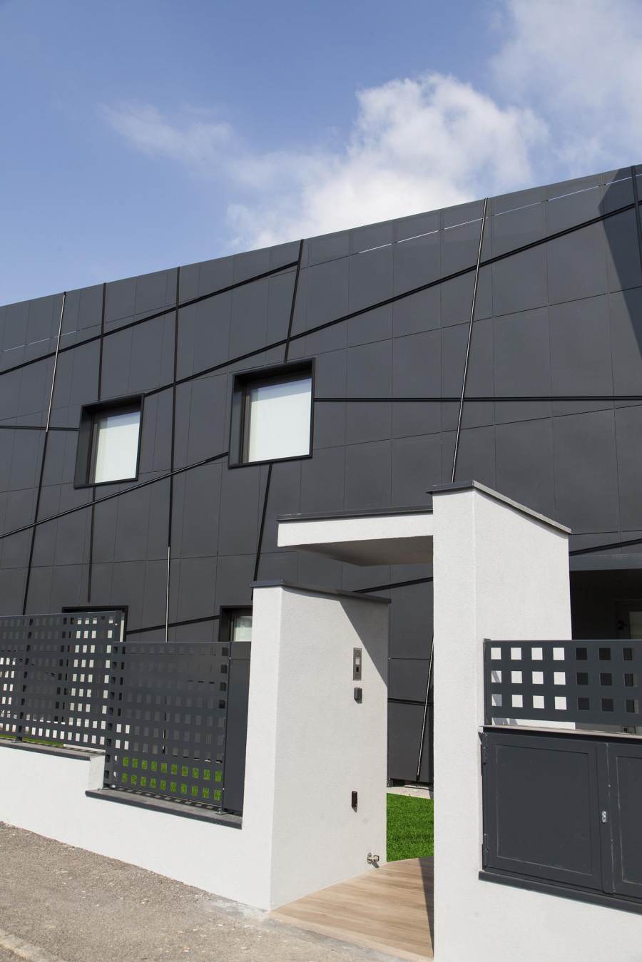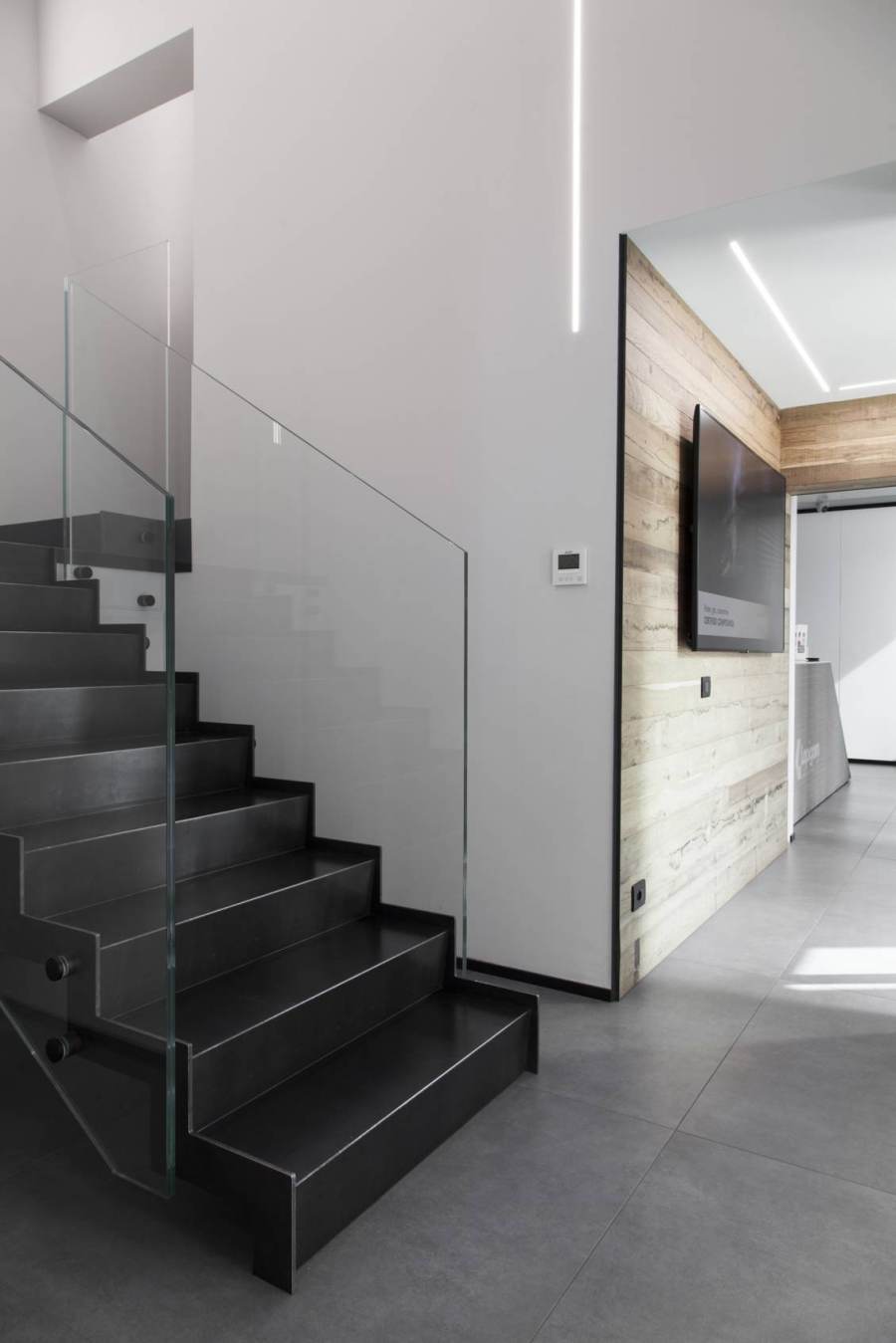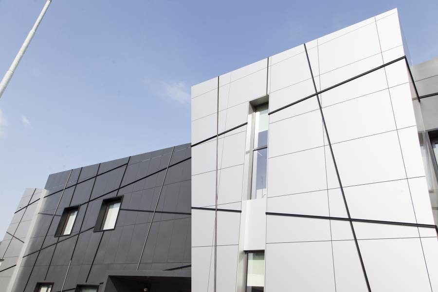 L'esigenza era quella di creare un'immagine aziendale totalmente nuova e moderna, obiettivo raggiunto grazie ad una facciata dinamica, caratterizzata da sagoma e tagli fortemente geometrici e diagonali realizzata in lamiera forata. Le diverse tonalità di grigio della lamiera definiscono i diversi volumi che compongono lo stabile, contribuendo ad affermare il forte senso di dinamicità dell'intero progetto