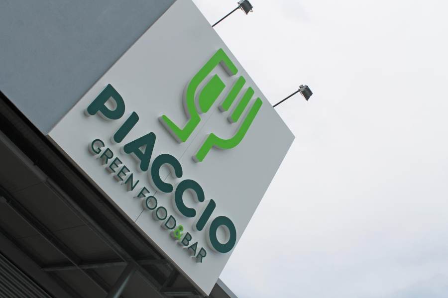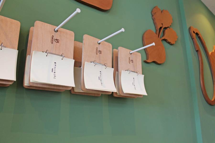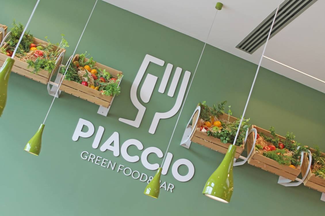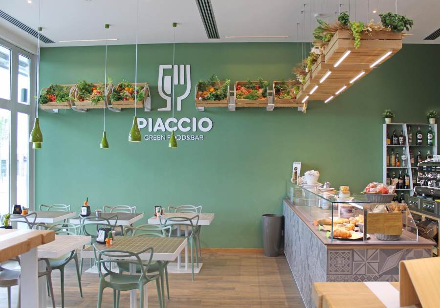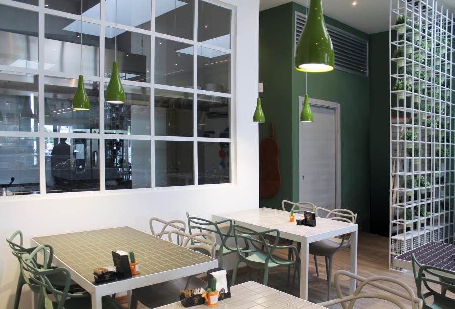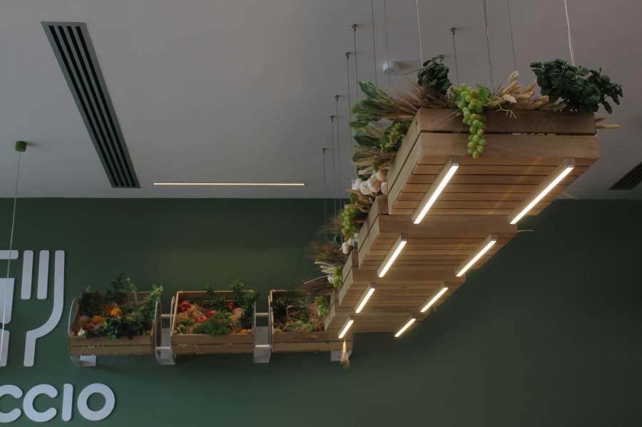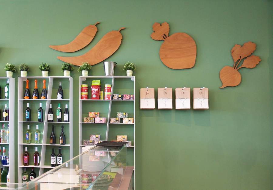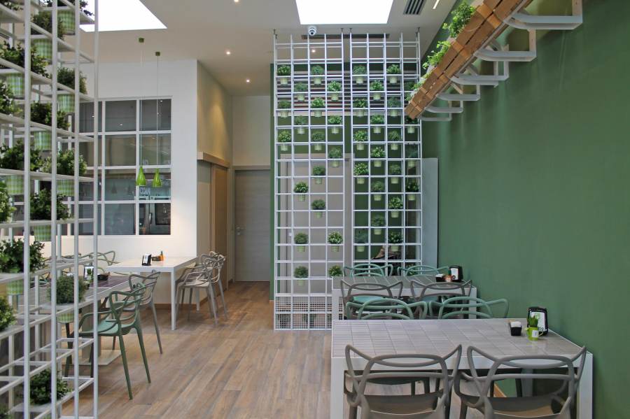 Il design è curato nei minimi dettagli, allestimento con cassette di frutta alle pareti e utilizzate come corpi illuminanti, colori e materiali naturali, giochi grafici in legno: tutto pensato per richiamare il concetto di "green food".