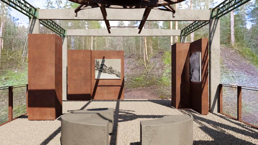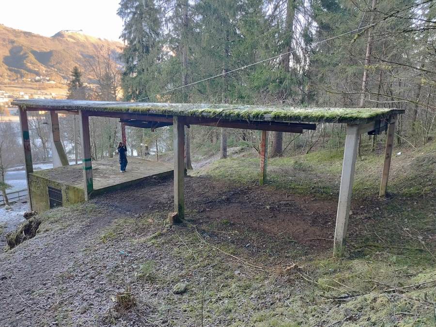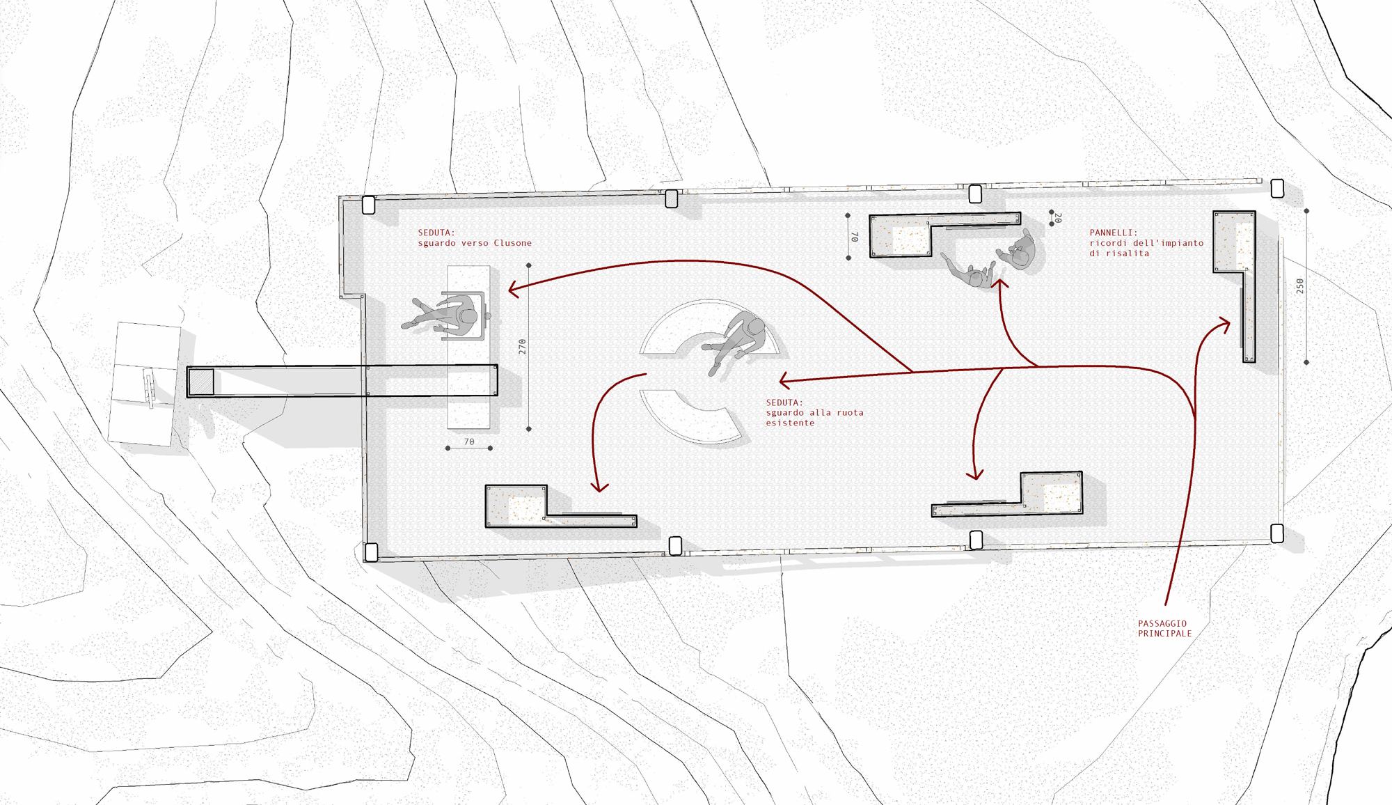 L’impianto si trova al margine del bosco, incorniciato da alberi su tre lati e affacciato sull’altopiano di Clusone. Proprio questa vista ha guidato la progettazione interna: nella zona frontale sono state create due aree di seduta in cemento, una principale sormontata dal seggiolino originale della seggiovia e una circolare che permette di osservare il panorama a 360 gradi. Sul lato rivolto verso il bosco sono stati posizionati quattro box in lamiera corten, disposti lungo un percorso e destinati a ospitare pannelli informativi con testi e immagini sulla storia dell’impianto.