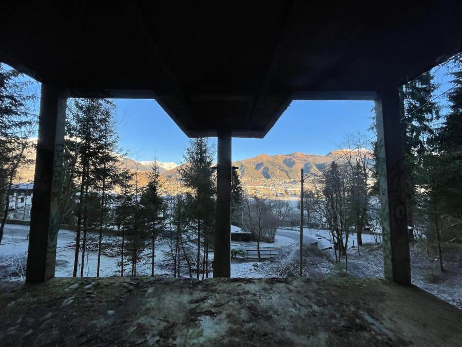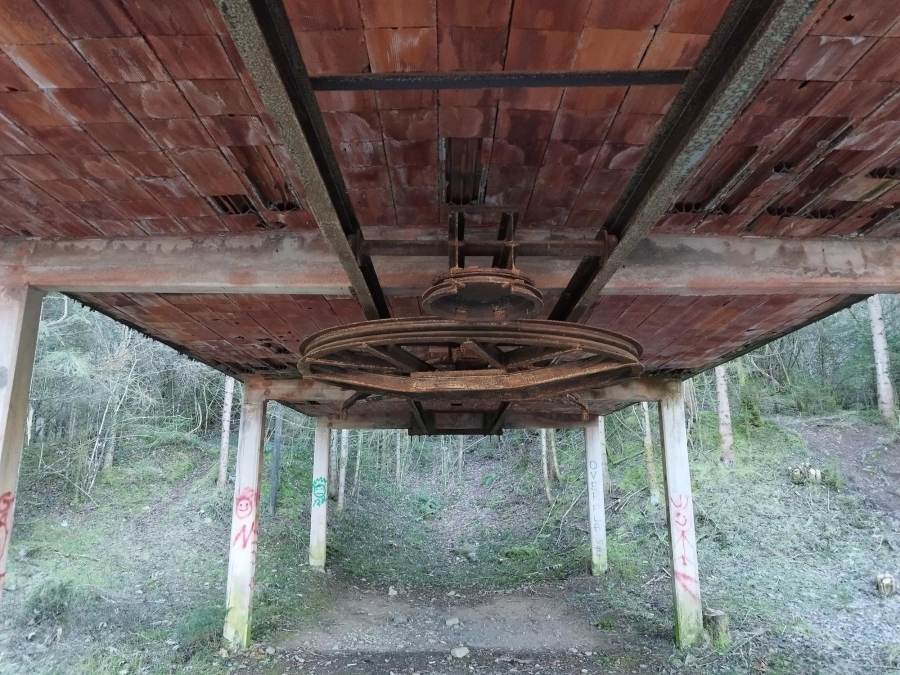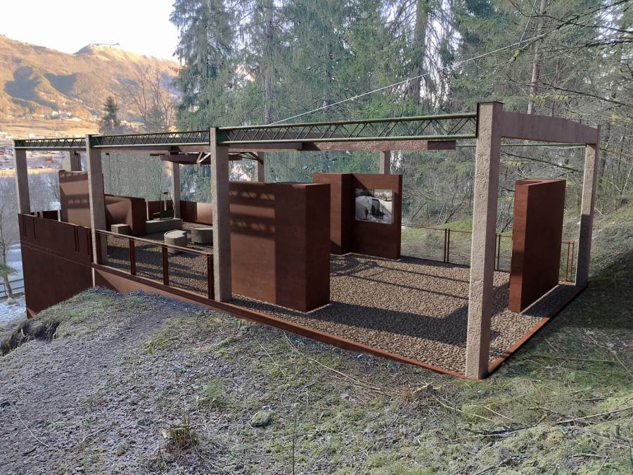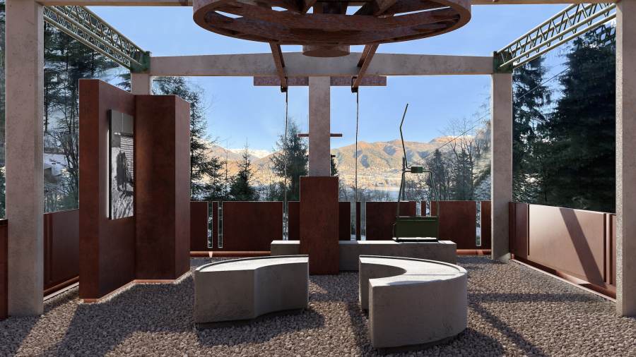Il tetto è stato completamente rimosso e sostituito da travi in ferro effetto rame ossidato, che rinsaldano lo scheletro originario in cemento, volutamente lasciato a vista dopo una pulitura che ne esalta l’essenza. Questa scelta mette al centro la vera protagonista del luogo: la ruota meccanica che azionava la seggiovia, oggi interamente segnata dalla ruggine. La base della struttura, mantenuta nella forma originale, è rivestita con una pelle di lamiera corten che dialoga con il colore della ruota storica. La sicurezza dell’area viene infine garantita da un parapetto leggero nello stesso materiale, in continuità con l’identità del sito e il suo spirito originario.