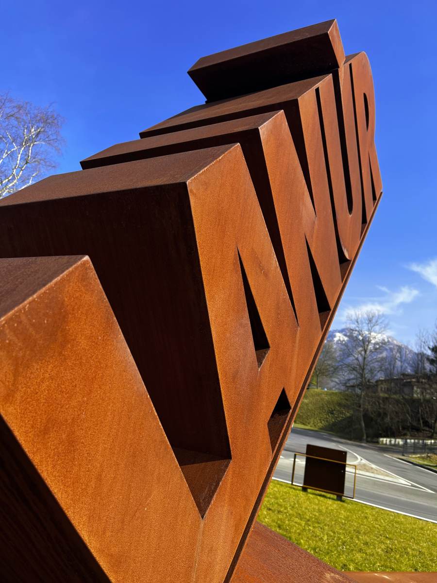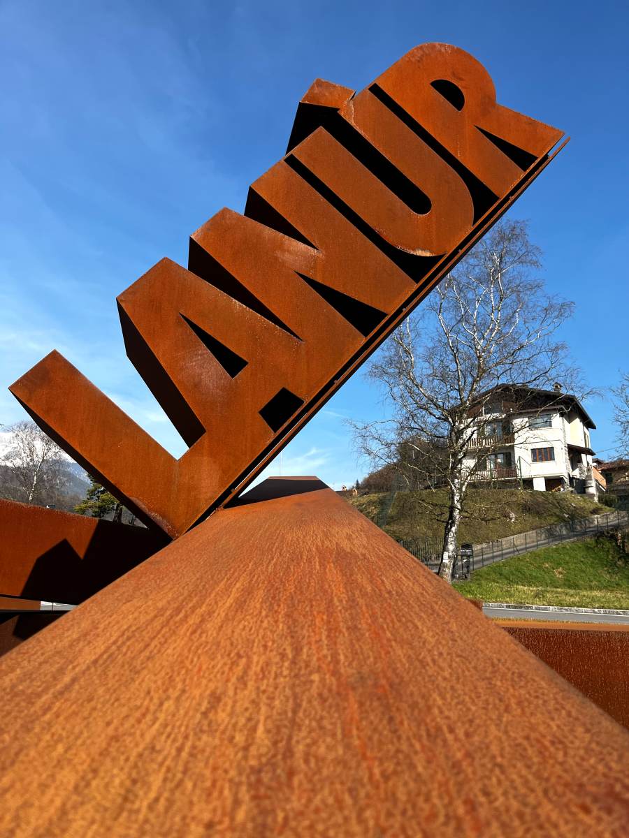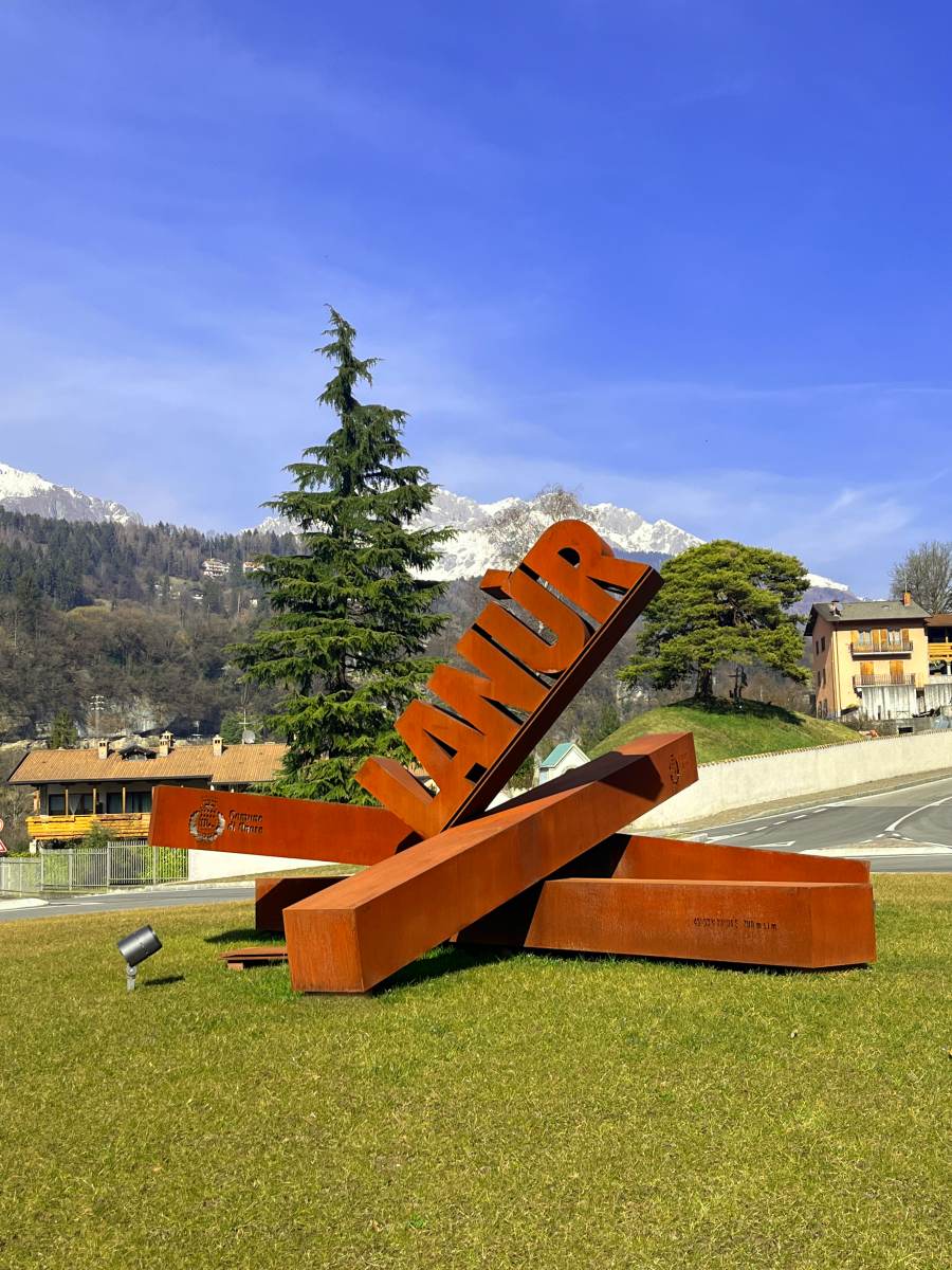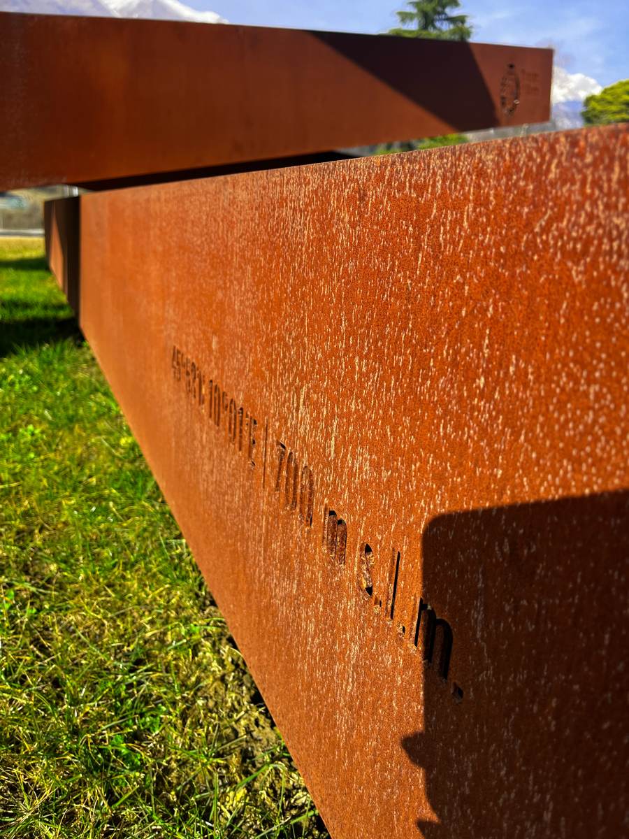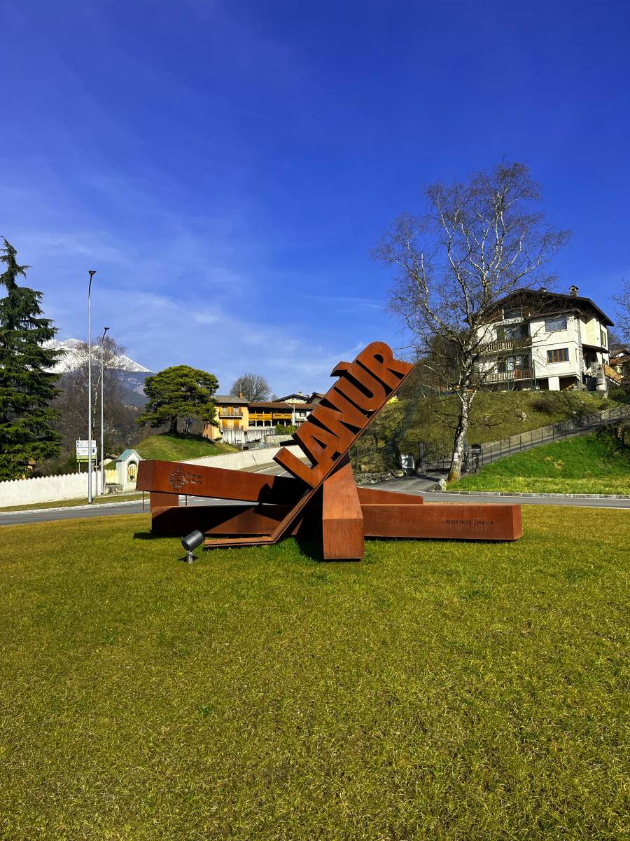 A emergere con forza è la scritta LANÙR, elemento centrale dell’installazione. Un segno deciso, che si staglia verso il cielo e richiama l’antico nome del paese, “Lanorium”, legato alla storica lavorazione della lana. Un richiamo alle radici che diventa simbolo contemporaneo.