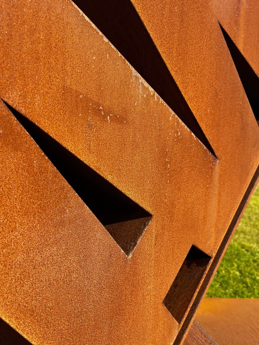L’intervento si compone di una serie di parallelepipedi in acciaio corten, sovrapposti in equilibrio dinamico. Una composizione apparentemente irregolare, ispirata al gioco dello Shangai, che genera movimento, tensione e direzionalità, accompagnando lo sguardo verso l’alto.