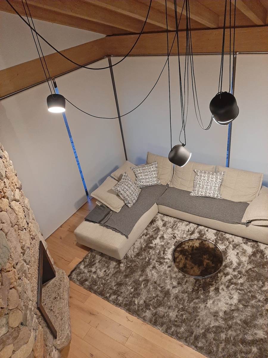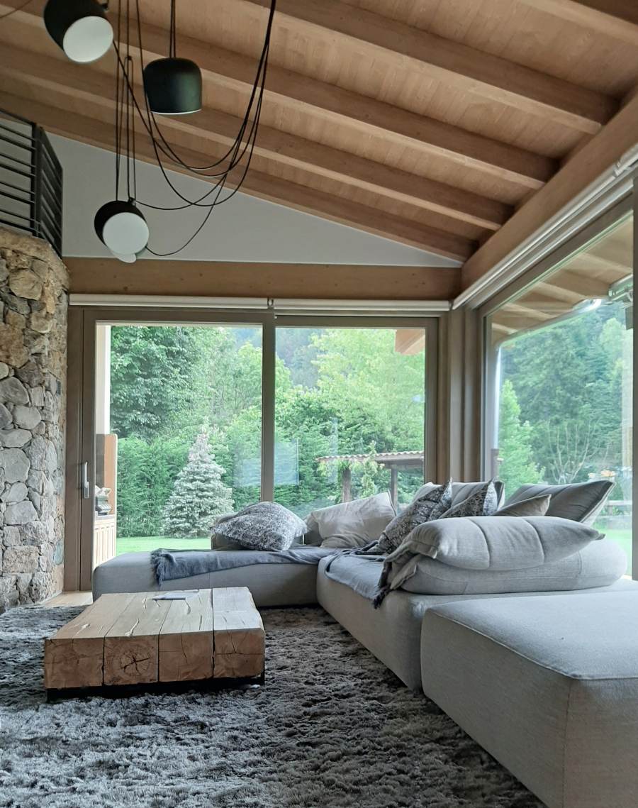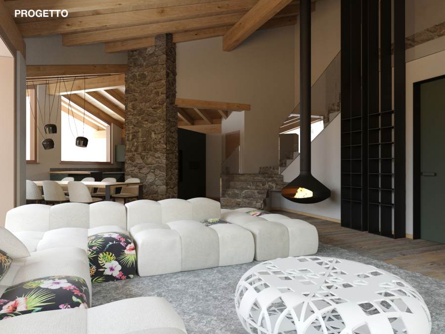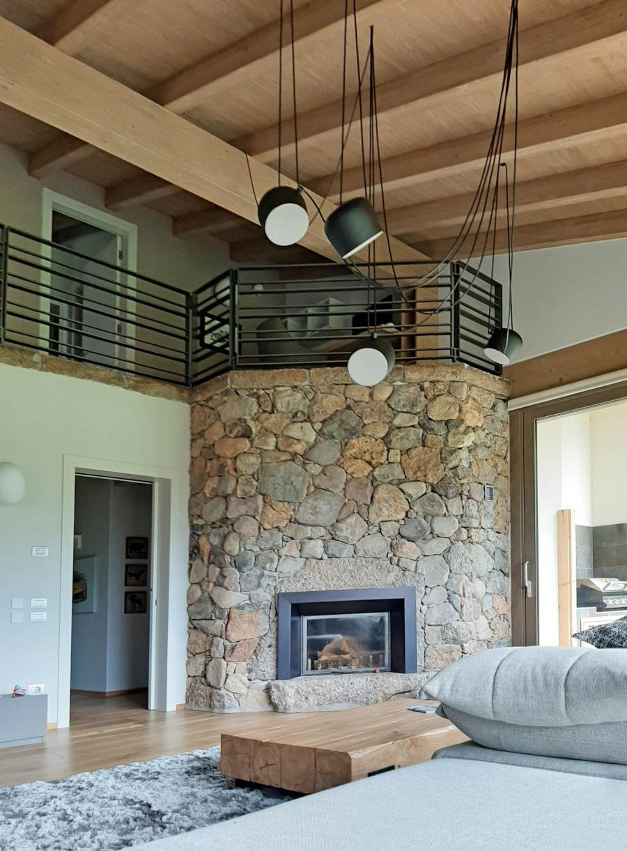 Lo stile adottato per questo progetto è una fusione di tratti rustici, legati allo stile alpino, come pietre grezze e legno, e arredi assolutamente moderni, dettagli di design dallo stile minimal.