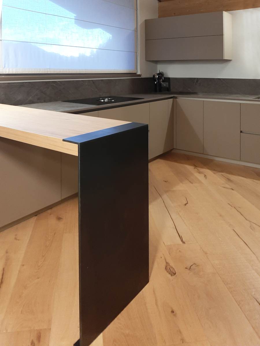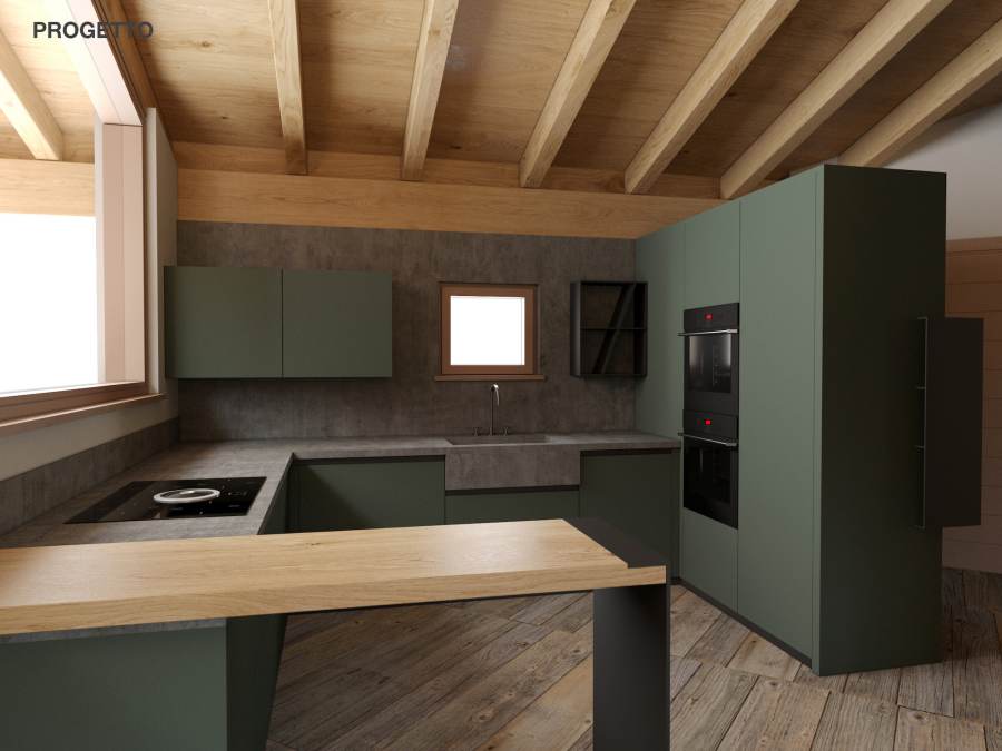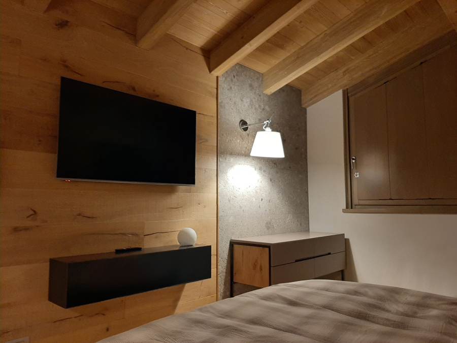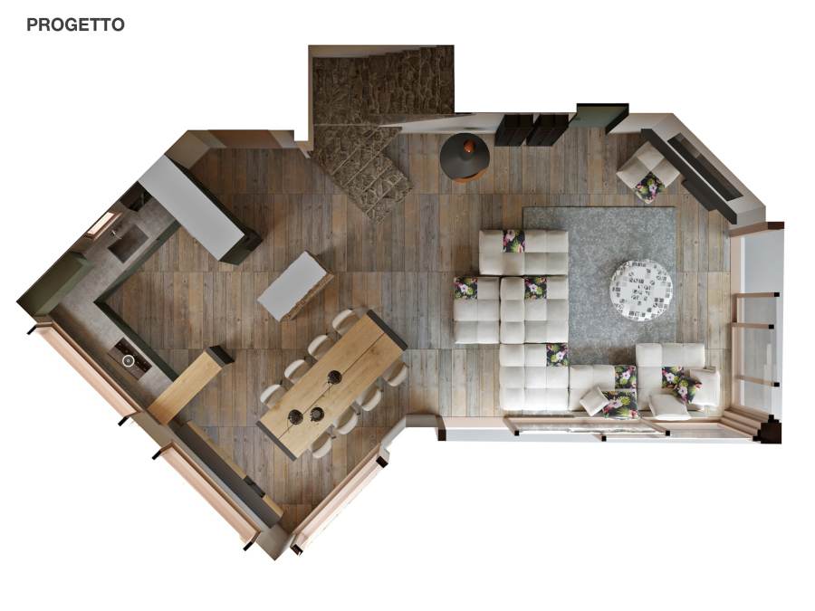 Lo stile adottato per questo progetto è una fusione di tratti rustici, legati allo stile alpino, come pietre grezze e legno, e arredi assolutamente moderni, dettagli di design dallo stile minimal.