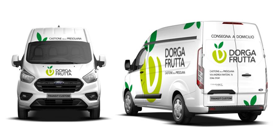 Con l'avvento della nuova gestione il negozio si è rinnovato negli ambienti interni (sempre affidandosi al nostro Studio) ed ha sentito forte la necessità di identificarsi in un marchio, un segno forte, dal design fresco, che fosse in grado di contraddistinguere la nuova generazione di Dorga Frutta.