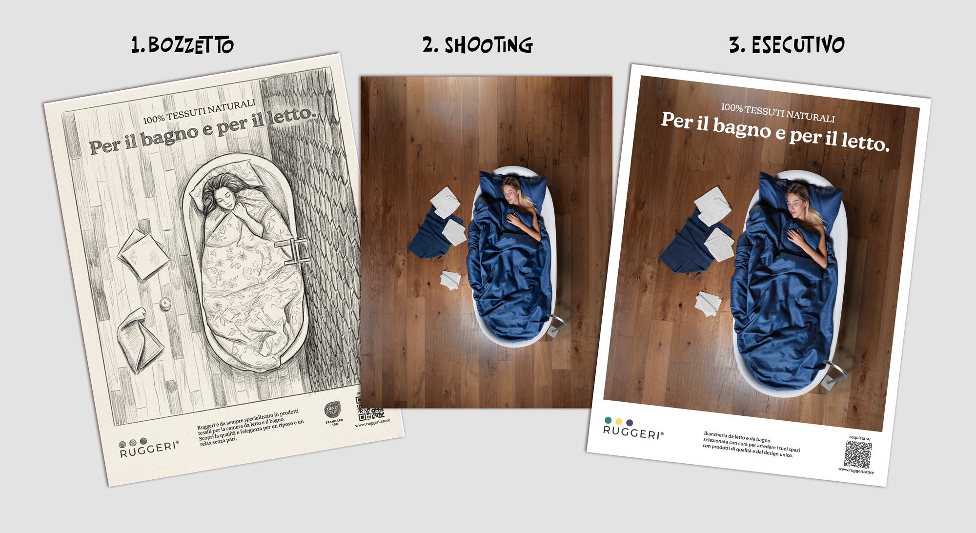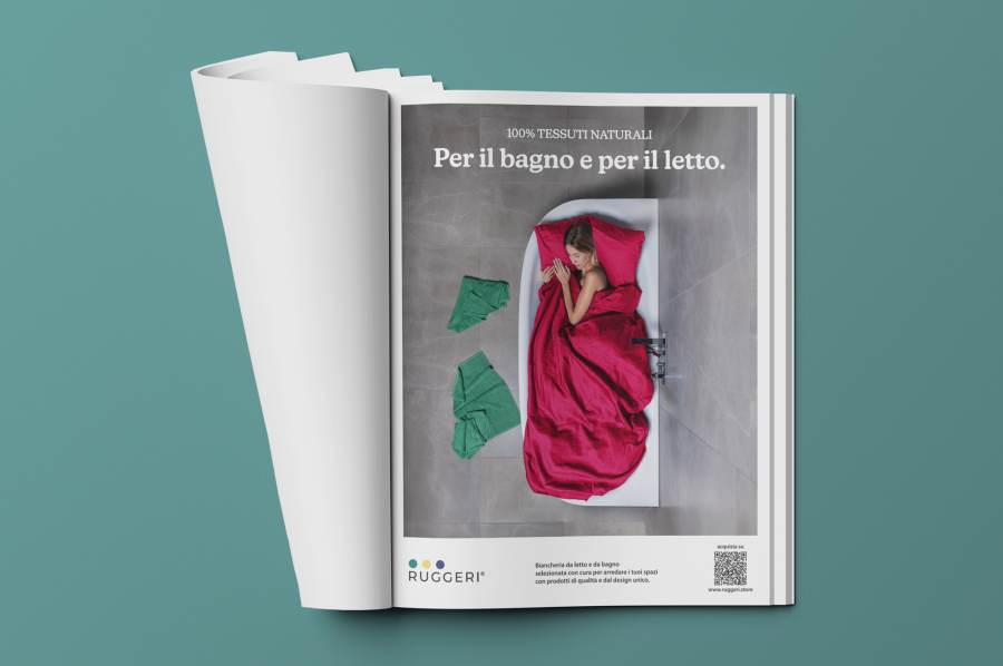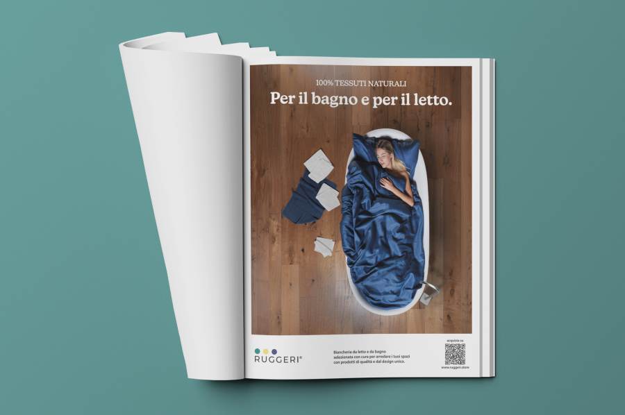 Abbiamo ideato un concept visivo basato sulla fusione di due mondi, bagno e letto, traducendo in immagine la versatilità dei prodotti Ruggeri in modo diretto e sorprendente.