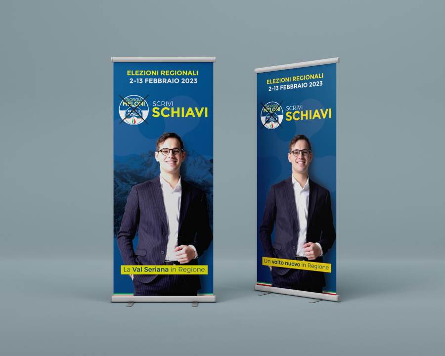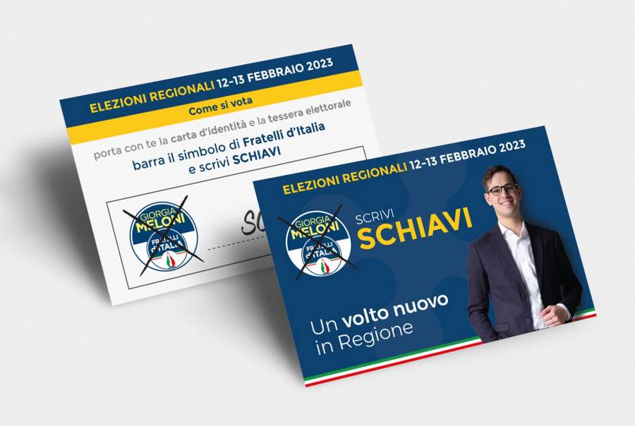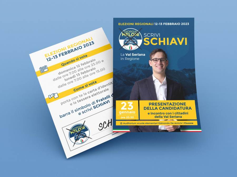 Progettazione di materiale di comunicazione per il candidato alle elezioni regionali Michele Schiavi - Fratelli d'Italia.